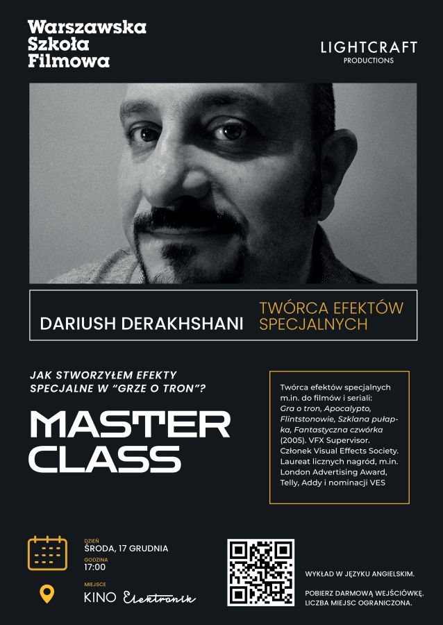 Dariush Derakhshani jest wielokrotnie nagradzanym Supervisorem VFX, producentem i pedagogiem w Los Angeles. Od ponad 25 lat jest animatorem i nadzoruje niezliczone reklamy, programy telewizyjne i filmy fabularne w Digital Domain, Pixomondo, Zoic Studios, Radium ReelFX, Café FX, Rhythm and Hues, Sight Effects. Doradzał także studiom takim jak Unity, JibJab Studios, Square Enix, Mandoo Pictures i Digital Frontier (Tokyo). Dariush uzyskał tytuł licencjata na Uniwersytecie Lehigh w dziedzinie architektury i teatru oraz tytuł magistra w dziedzinie animacji filmowej, telewizyjnej i komputerowej w USC School of Cinematic Arts i wykłada tę dziedzinę wiedzy od ponad dwudziestu lat. Jest także autorem kilku książek o 3ds Max i Maya oraz licznych programów szkoleniowych wideo dla LinkedIn, fxphd i Pluralsight. Dariush był również wysłannikiem eksperta filmowego w programie American Film Showcase Departamentu Stanu USA, jako prowadzący programy edukacyjne w Armenii. W 2020 roku Dariush dołączył do Instytutu Johna Hughesa jako jego dziekan akademicki, odpowiedzialny za tworzenie i dostarczanie programów nauczania dla filmów i animacji dla klientów takich jak Arizona State University, York University w Kanadzie i The One Academy w Malezji. Dariush jest wieloletnim członkiem Visual Effects Society. Ostatnio zdobył wyróżnienie za swoją pracę VFX na Sitges Film Festival, a także London Advertising Award, wiele nagród Telly i Addy, brązową tablicę z Columbus Film Festival za własną animację i był nominowany do nagrody VES. Obecnie pracuje przy filmie animowanym “Kraina Snów”, który uzyskał zachęty Polskiego Instytutu Sztuki Filmowej.