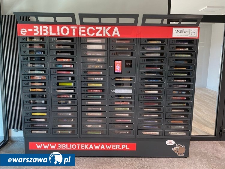 E-biblioteczka (czyli książkomat) znajduje się w budynku Warszawskiego Centrum Kultury. W każdej skrytce bibliotekarz umieszcza jedną książkę. Należy zalogować się na urządzeniu przy pomocy karty bibliotecznej i złożyć deklarację o chęci wypożyczenia książki. Należy pamiętać o podaniu numeru skrzynki.