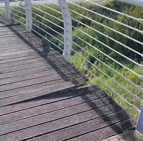 Na filmie widać zniszczone klepki na mostku oraz blokadę przy wejściu. Mostek nie nadaje się do użytku już od około roku.