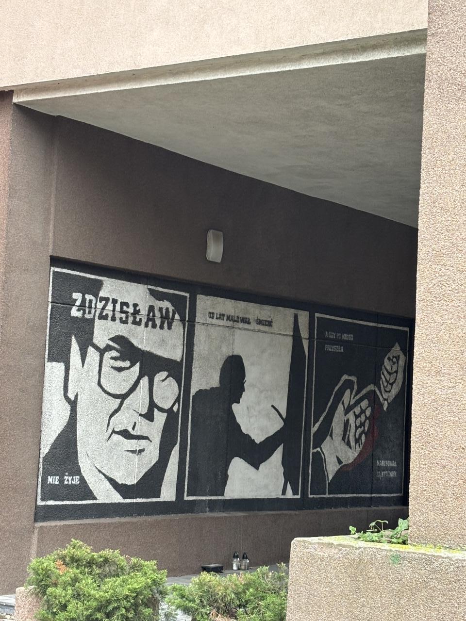 Wcześniejszy mural - bo stworzony zaledwie lata po śmierci artysty - powstał na ścianach budynku, w którym mieszkał. "Zdzisław Beksiński. Od lat malował śmierć. A gdy po niego przyszła, narysował ją kto inny" - brzmi napis dzieła.