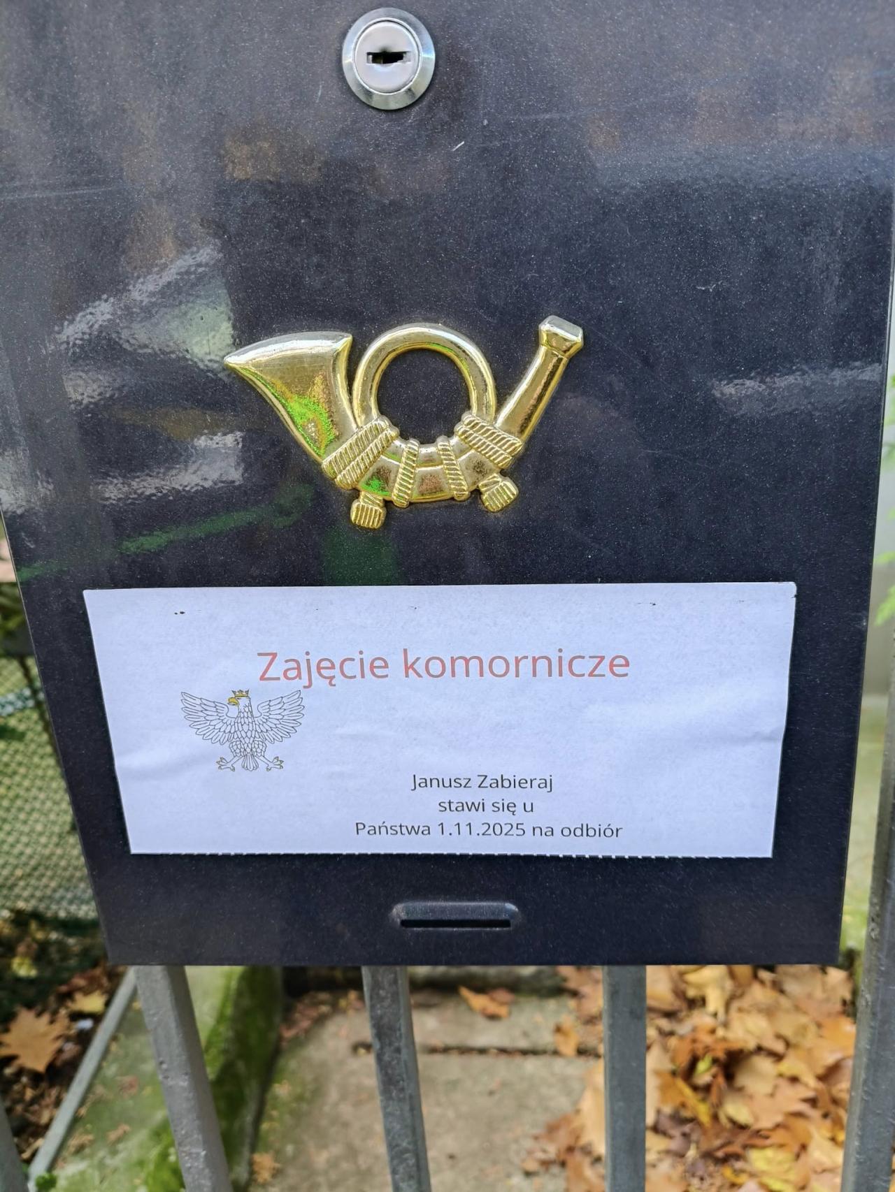 Natomiast w sobotę rano na Bielanach mieszkańcy zauważyli na niektórych skrzynkach pocztowych enigmatyczne karteczki o treści "Zajęcie komornicze. Janusz Zbieraj stawi się u Państwa 1.11.2025 na odbiór".