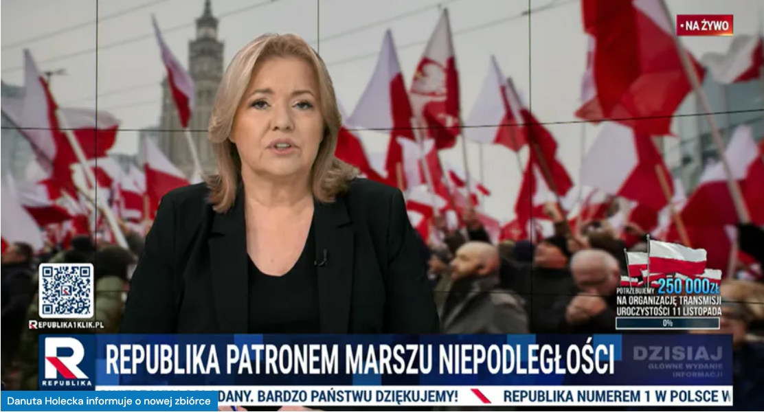 11 listopada tradycyjnie w Warszawie odbędzie się Marsz Niepodległości. W związku z tym stacja Republika rozpoczęła zbiórkę 250 tys. złotych. Danuta Holecka w programie "Dzisiaj" poinformowała, że stacja została oficjalnym patronem medialnym wydarzenia i będzie je na swojej antenie relacjonować. W związku z tym wsparcie jest "niezbędne, aby pokryć koszty organizacji tego przedsięwzięcia" - usłyszeliśmy na antenie.