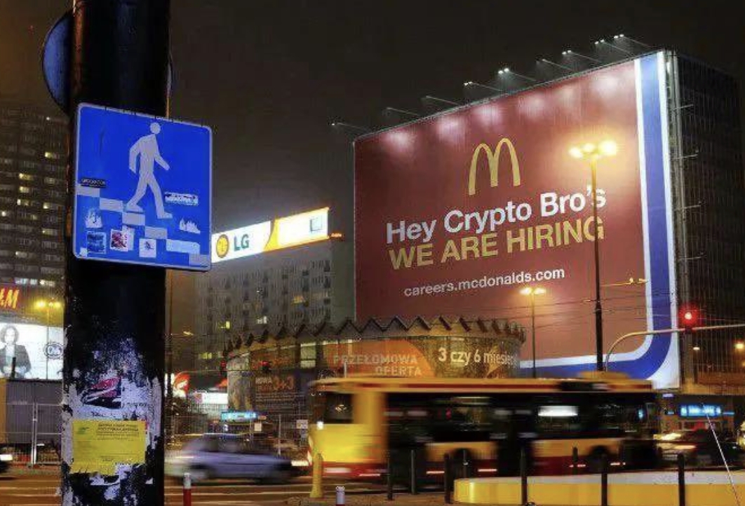W ostatnich dniach załamał się kurs bitcoina (spadł o 15% w 1 miesiąc). W amerykańskich mediach społecznościowych rozsyłane jest zdjęcie rzekomej reklamy McDonald's przy warszawskiej Rotundzie, z hasłem 'HEY CRYPTO BRO'S - WE ARE HIRING' - co można przetłumaczyć jako 'Hej, krypto-bracia - zatrudniamy!'. Wiele osób udostępnia ten post. To jednak fejk - to zdjęcie nie jest prawdziwe.