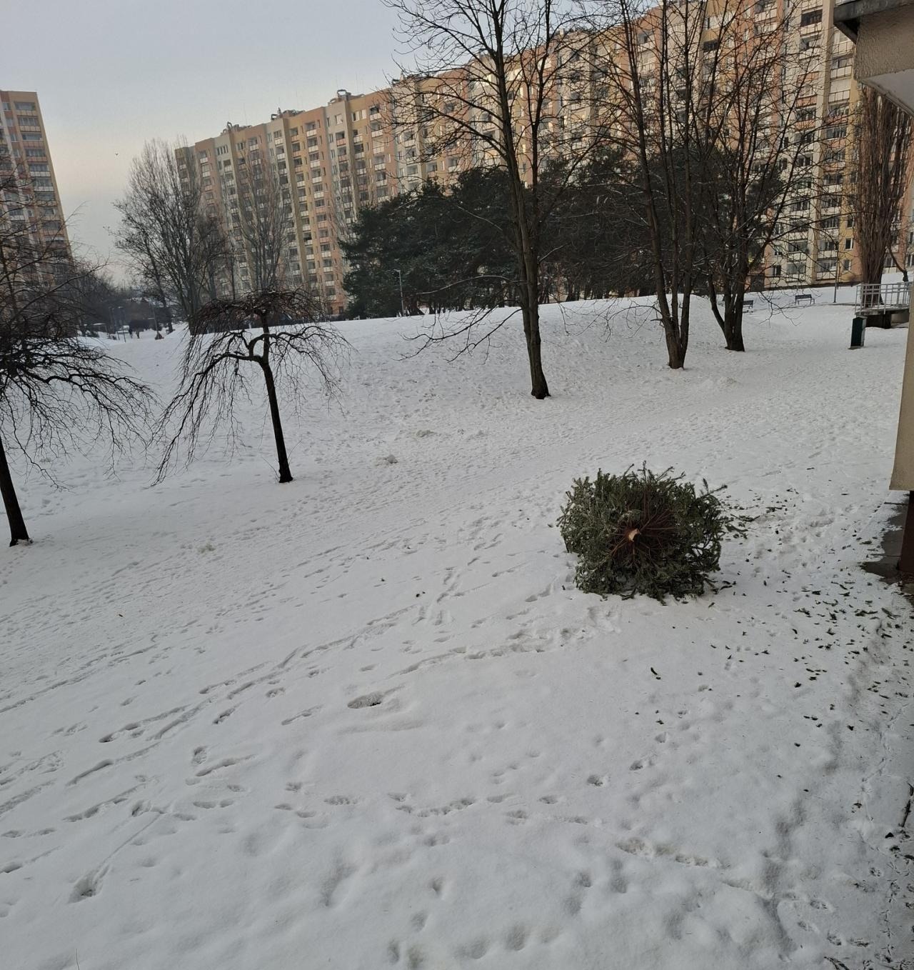 Mieszkańcy tego bloku mają taki zwyczaj, że wyrzucają choinki przez balkon, ale zaraz po wszystkim schodzą na dół, żeby odstawić choinkę w odpowiednie miejsce.