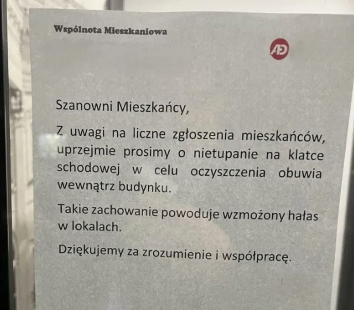 "Z uwagi na liczne zgłoszenia mieszkańców, uprzejmie prosimy o nietupanien na klatce schodowej w celu oczyszczenia obuwia wewnątrz budynku. Takie zachowanie powoduje wzmożony hałas w lokalach" - napisała na ogłoszeniu ściennym Wspólnota Mieszkaniowa Forum Wola.