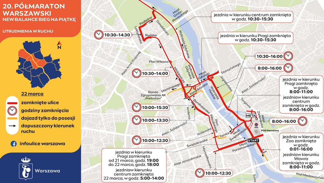 Bieg na 5 kilometrów rozpocznie się w niedzielę o godzinie 9:00, natomiast start półmaratonu zaplanowano na 11:00 na moście Poniatowskiego. Uczestnicy pobiegną na północ ulicami Nowy Świat, Krakowskie Przedmieście, Miodową, Bonifraterską, Andersa i Mickiewicza, docierając do Placu Wilsona. Następnie trasa poprowadzi na Bielany, skąd ulicą Wybrzeże Gdyńskie zawodnicy zawrócą na południe w kierunku Żoliborza. Dalej przebiegną przez Wisłę mostem Gdańskim na Pragę Północ, miną ogród zoologiczny, a meta - zgodnie z tradycją - znajdować się będzie na błoniach Stadionu Narodowego.