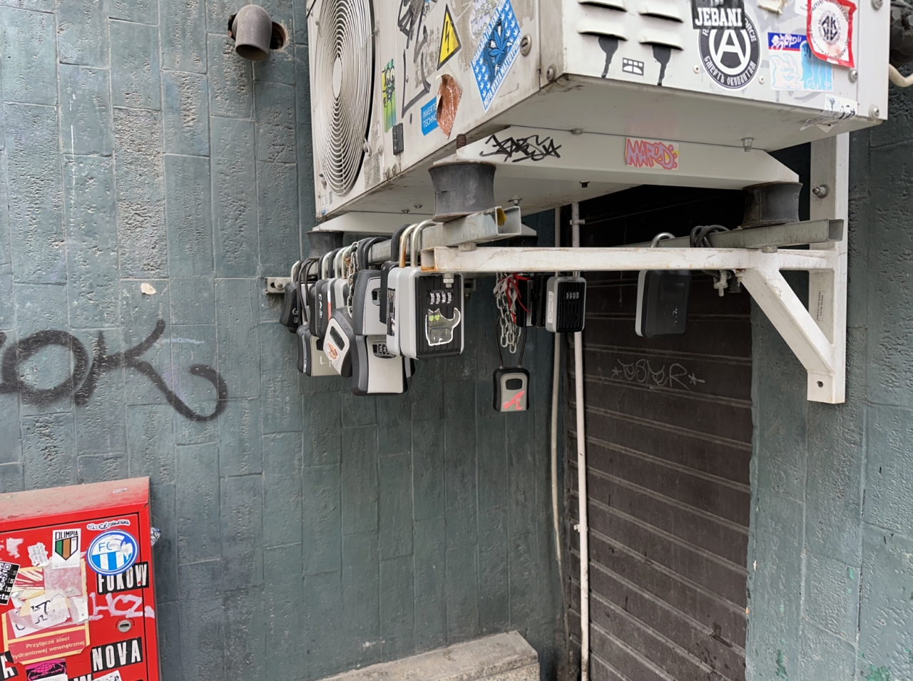 W wielu warszawskich kamienicach wspólnoty mieszkaniowe nie zgadzają się już na przykręcanie tego typu skrzynek do elewacji czy ścian na klatkach schodowych. Często wynika to z wymogów konserwatorskich, a nierzadko jest to po prostu forma buntu wspólnoty przeciwko masowemu wynajmowi krótkoterminowemu. W takiej sytuacji właściciel lokalu kupuje niewielki sejf w formie kłódki, zapina go np. na pobliskim ogrodzeniu lub konstrukcji i odpowiednio oznacza. Gość otrzymuje w wiadomości kod do skrytki i instrukcję, jak skrytkę rozpoznać.