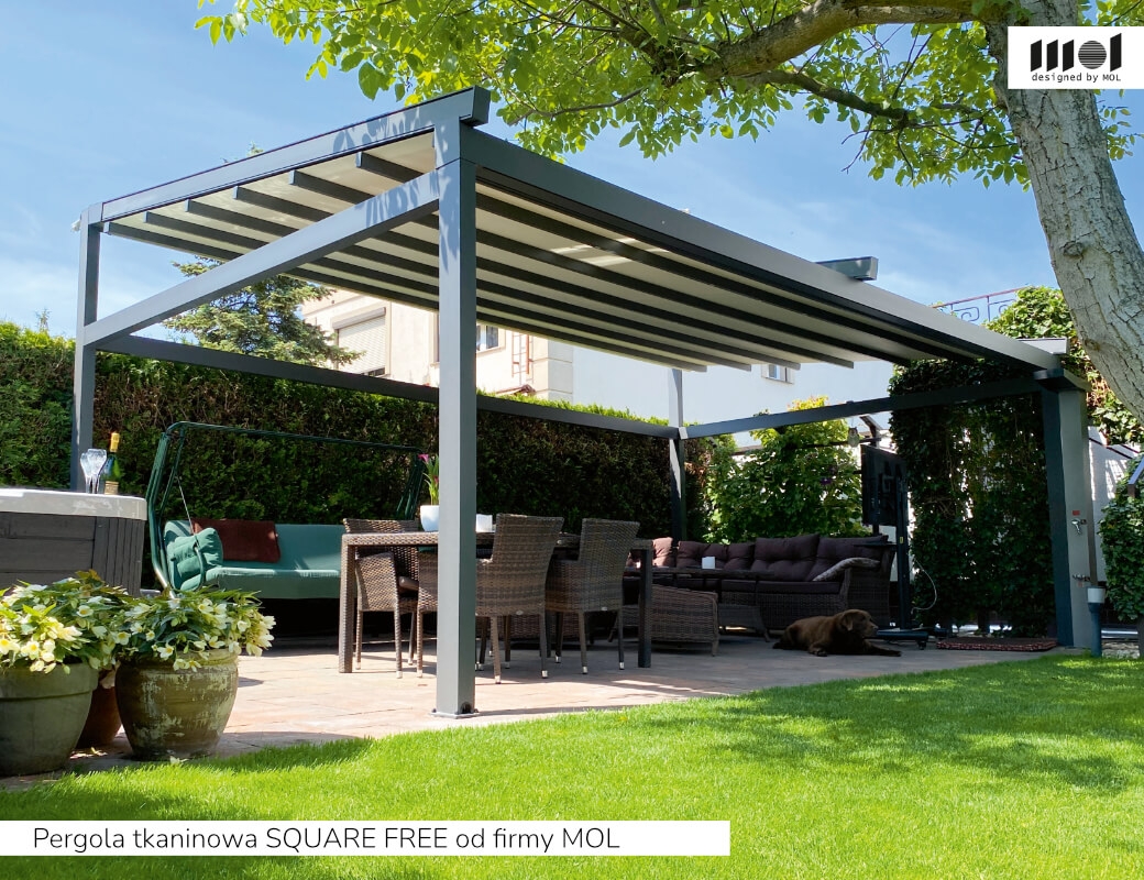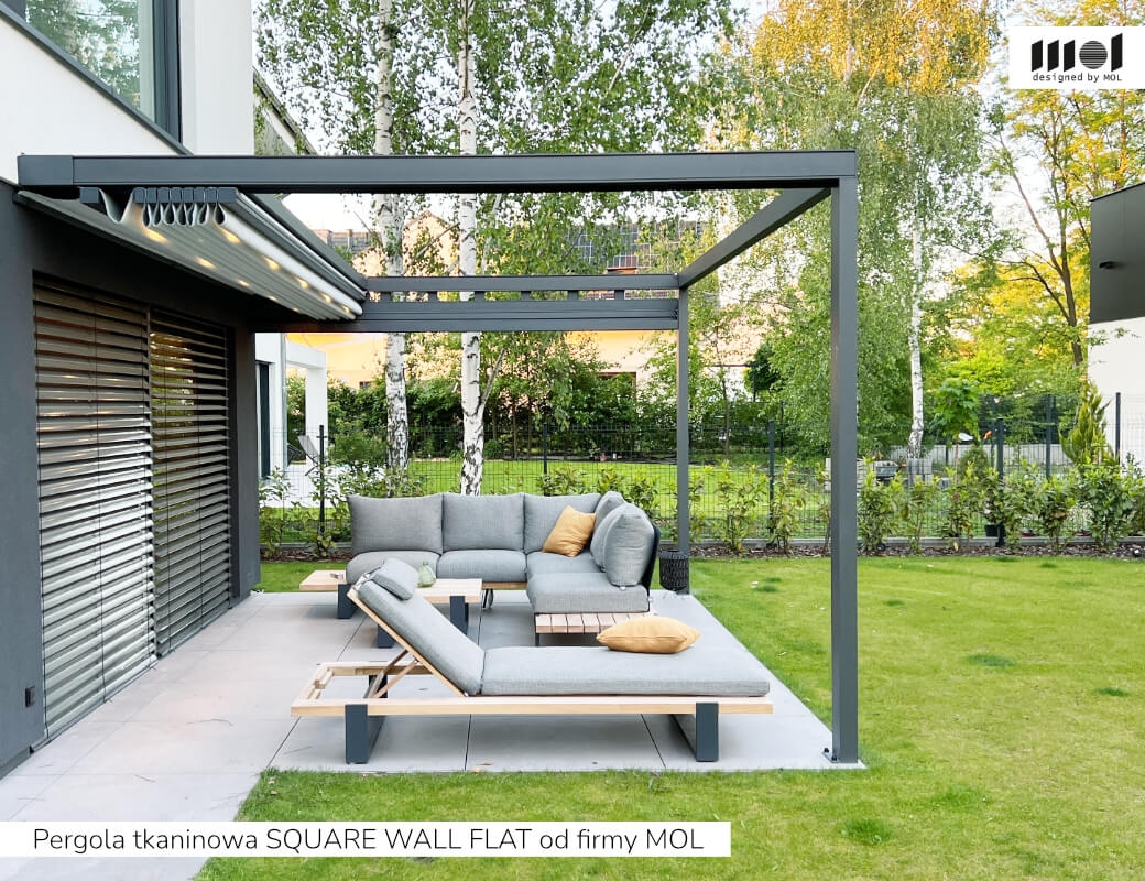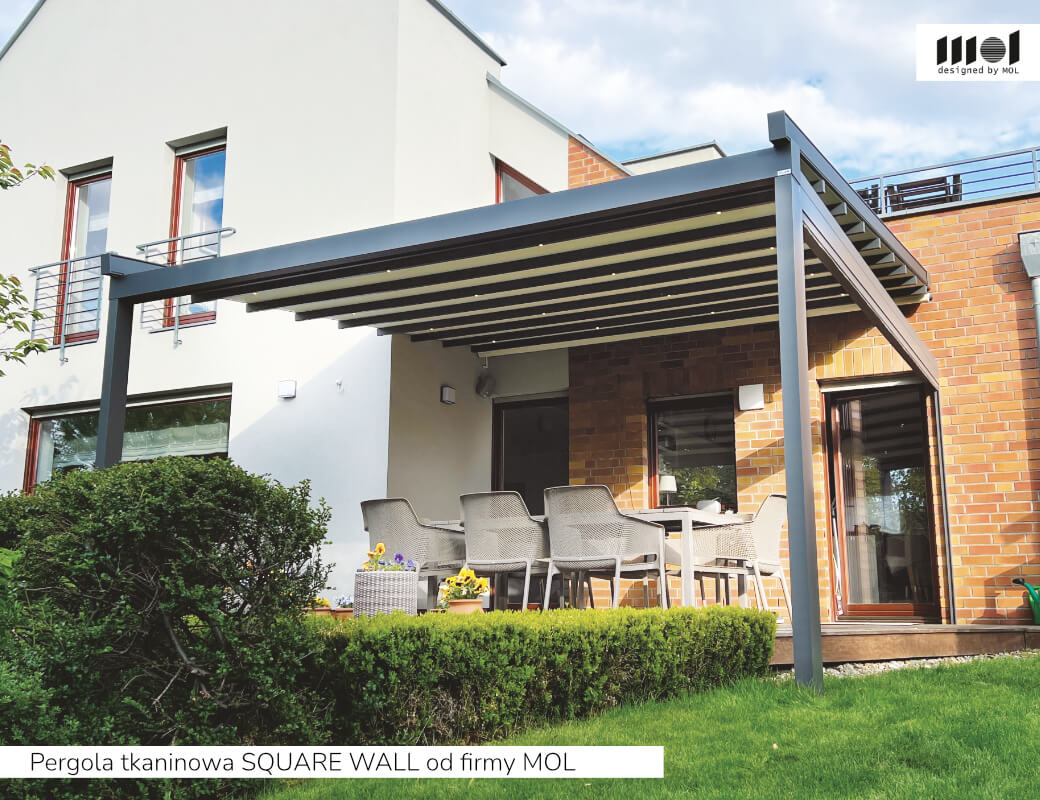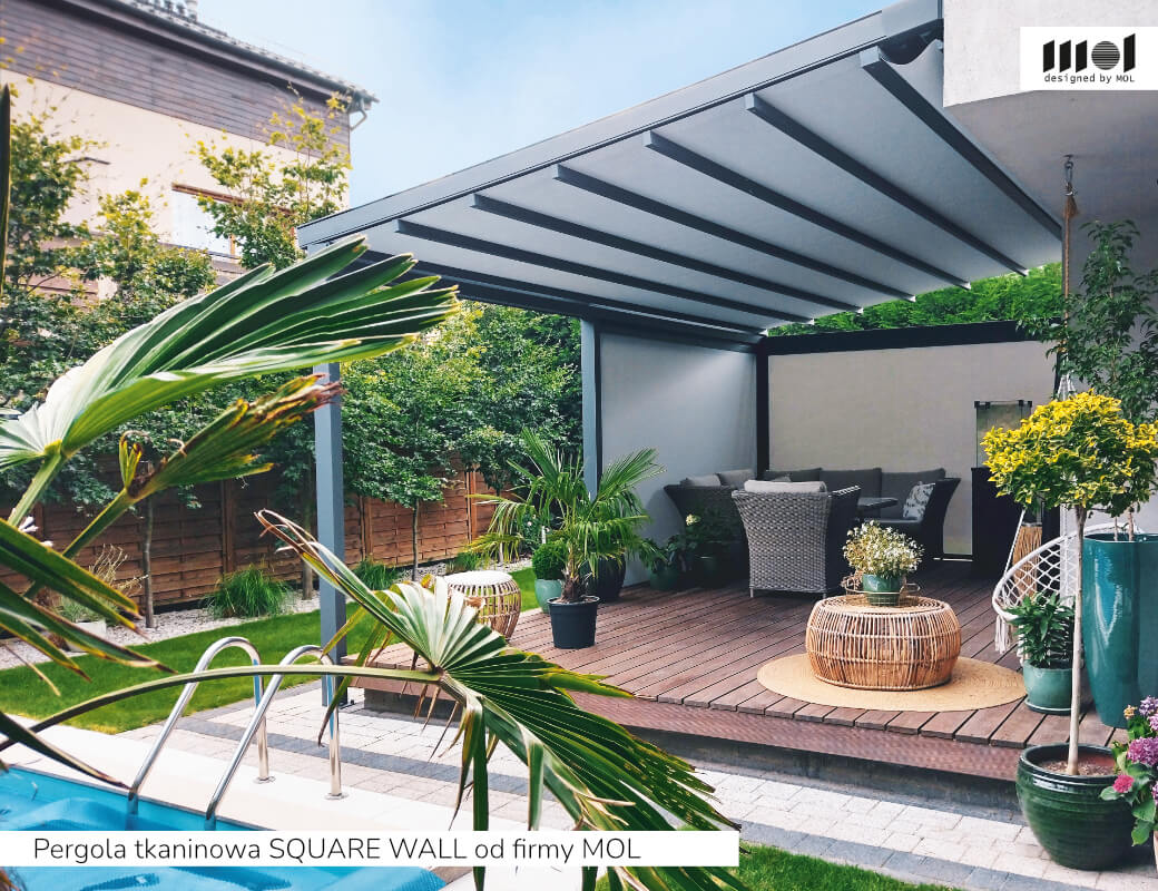 kolekcja SQUARE firmy MOL - zaawansowana pergola tkaninowa z napędem elektrycznym, dostępna w wielu konfiguracjach: przyścienna WALL, wolnostojąca FREE, podwójna DUO oraz z płaskim dachem FLAT, co pozwala idealnie dopasować ją do architektury i układu przestrzeni