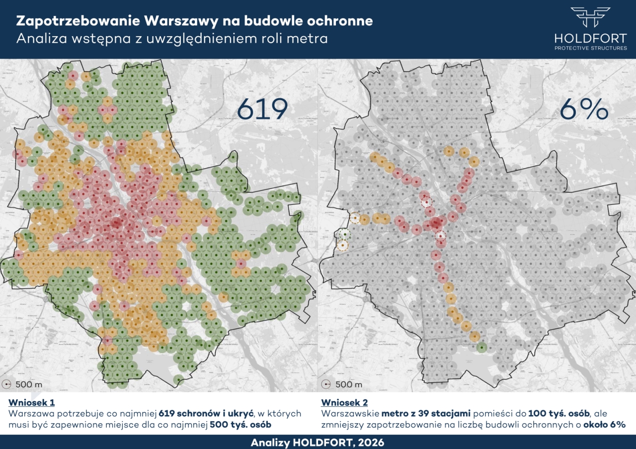 Warszawa stoi przed gigantycznym wyzwaniem logistycznym i budowlanym w zakresie ochrony cywilnej. Z najnowszej analizy firmy Holdfort, opartej na przepisach z listopada 2025 roku, wynika, że stolica potrzebuje co najmniej 619 profesjonalnych budowli ochronnych, aby zapewnić bezpieczeństwo mieszkańcom zgodnie z ustawowymi normami.