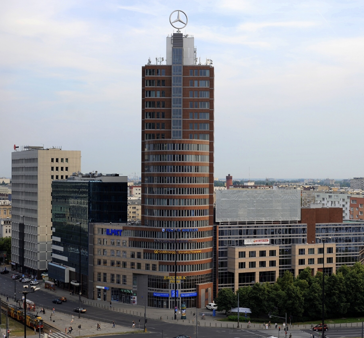 Wieżowiec z kręcącym się logo Mercedesa na dachu do wyburzenia