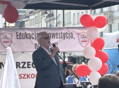 Jan Pietrzak przemawiał pod Kościołem św. Anny na manifestacji w sprawie edukacji. Później zaśpiewał