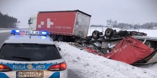 Naczepa ciężarówki w rowie. "Kierowca nie dostosował prędkości do trudnych warunków pogodowych"