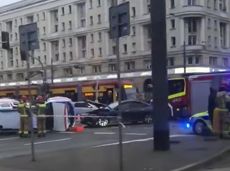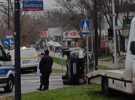 Zderzenie aut na Bielanach. Jedno dachowało i zatrzymało się na boku