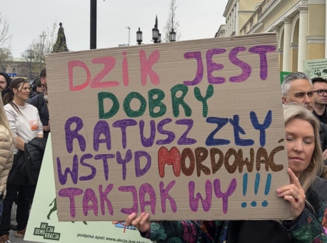 Obrońcy dzików przyszli pod ratusz. Mocne transparenty. "Warszawa to nie rzeźnia" [DUŻO ZDJĘĆ]