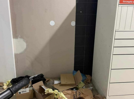 Zostawiają stertę kartonów i papierów przy paczkomacie. Dziewczyna prosi sąsiadów o zachowanie porządku