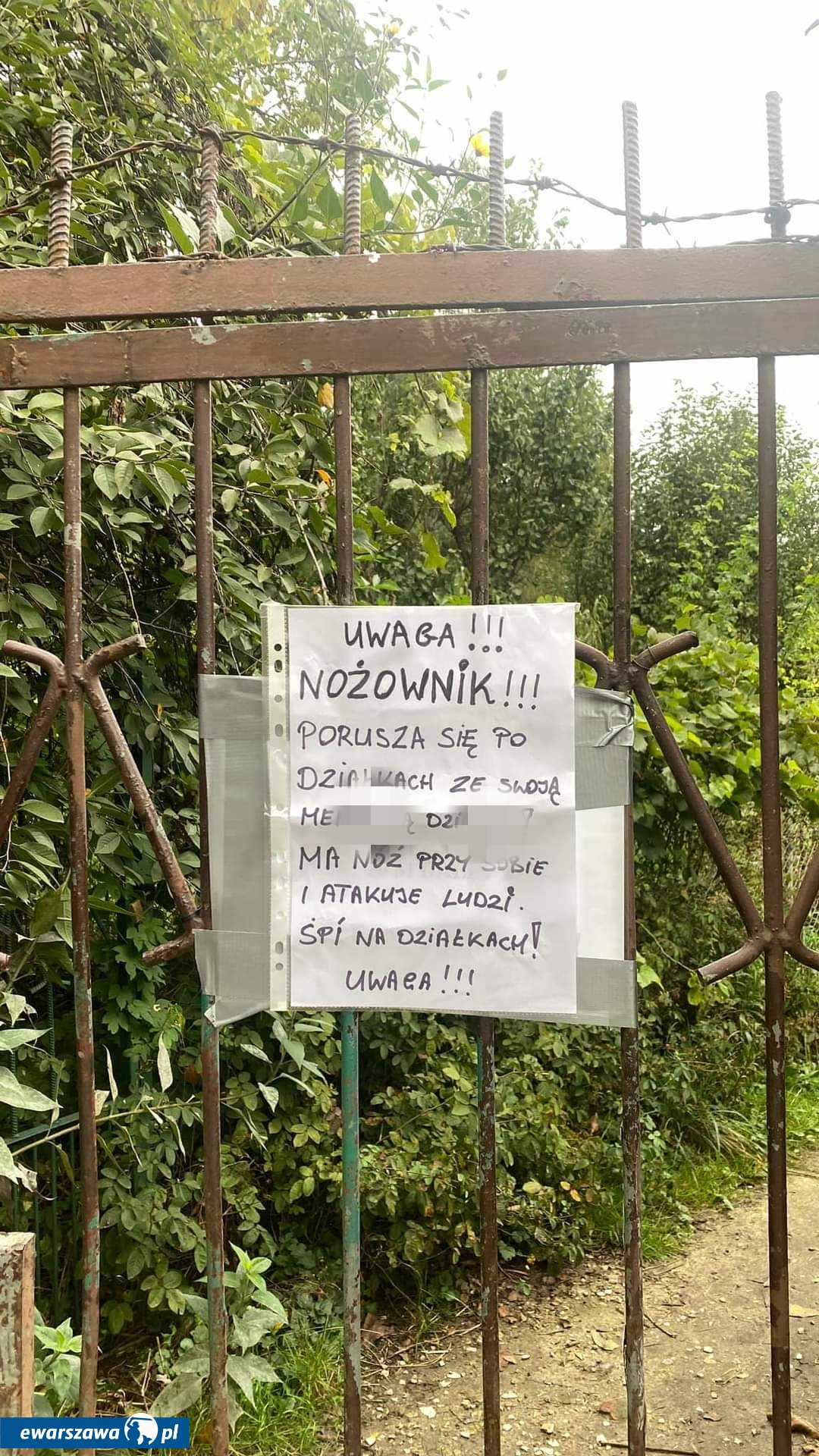 "Uwaga! Nożownik! Porusza się po działkach ze swoją mene*icą dzi*ką! Ma nóż przy sobie i atakuje ludzi. Śpi na działkach!"