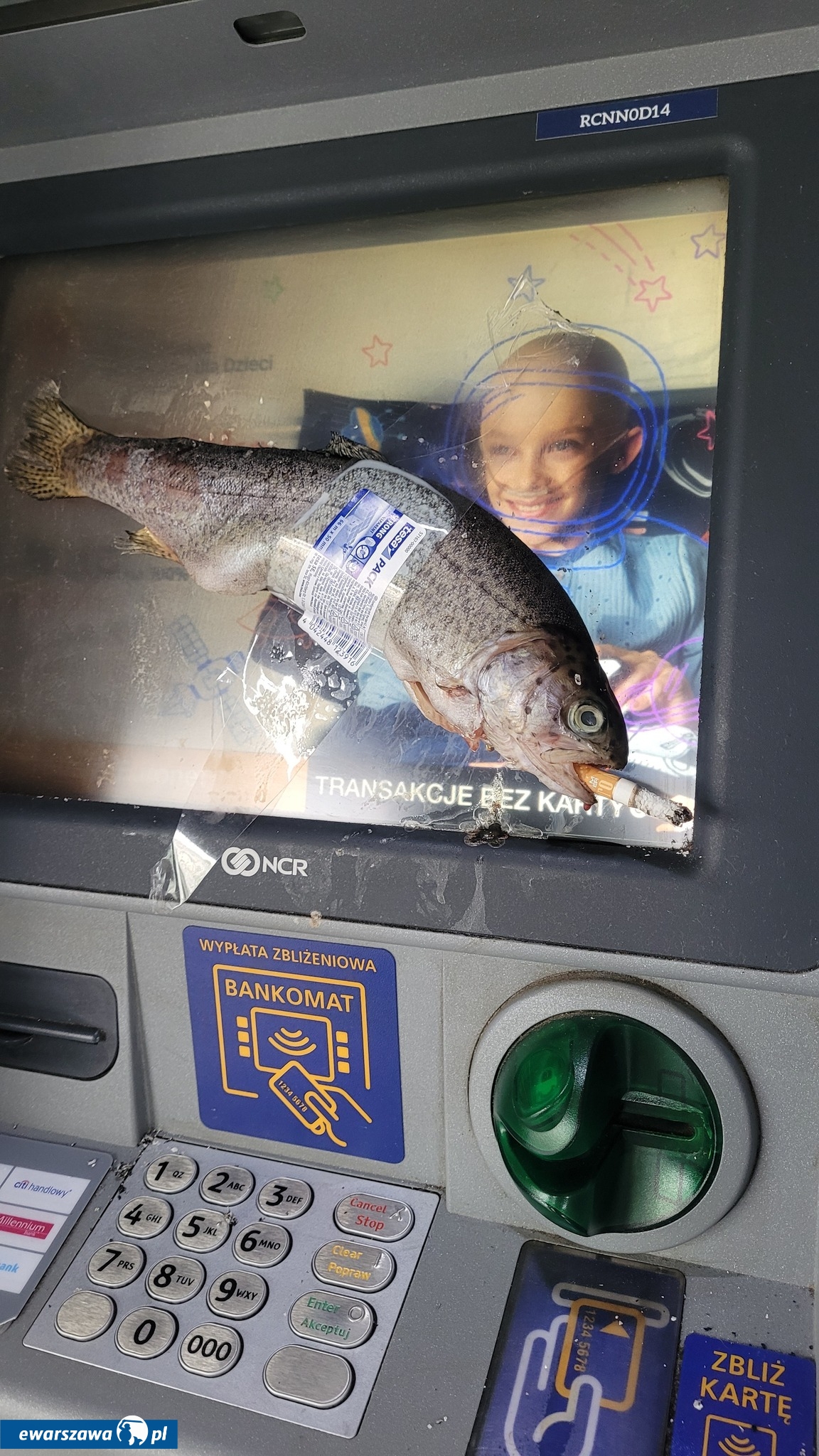 Zadziwiający widok na jednym z bankomatów. Ktoś przykleił martwego pstrąga z... papierosem