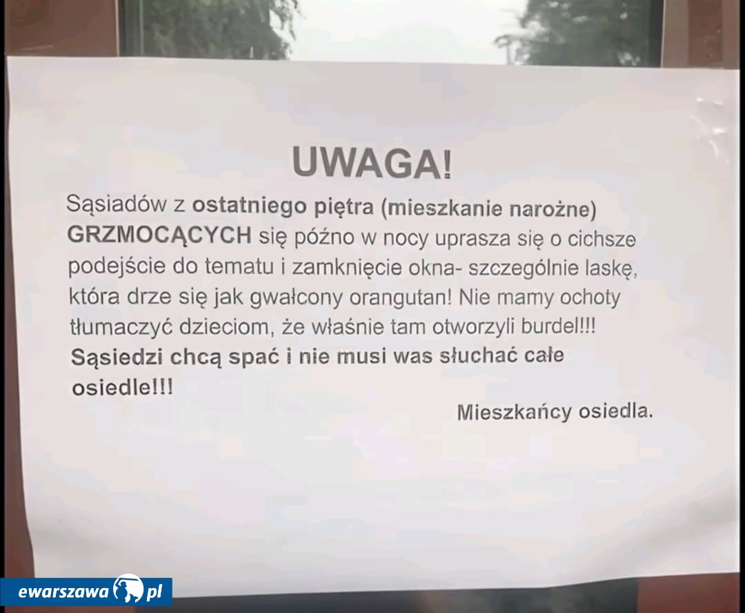 W jednym z bloków na warszawskich Stegnach pewna para zakłóca ciszę nocną odgłosami ze swojej sypialni. W związku z tym na klatce schodowej pojawiła się kartka, której zdjęcie zamieszczono na grupach sąsiedzkich w mediach społecznościowych. Jest to apel do uciążliwych lokatorów. - Sąsiadów z ostatniego piętra (mieszkanie narożne), którzy hałasują późno w nocy, uprasza się o cichsze podejście do tematu i zamknięcie okna - szczególnie tej pani, która drze się jak gwałcony orangutan. Nie mamy ochoty tłumaczyć dzieciom, że właśnie tam otworzyli bur... Sąsiedzi chcą spać, a całe osiedle nie musi was słuchać - czytamy.