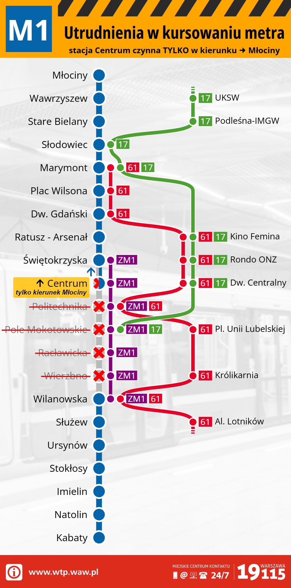 Obecnie pojazdy linii zastępczych, czyli autobusy i tramwaje wyjeżdżają na trasę z częstotliwością około 5 min. - W pierwszej kolejności technicy skupili się na położeniu nowych kabli światłowodowych. Te prace mają zakończyć się około godz. 1.00. Następnie, w nocy będą pracować nad zmianą sposobu zasilania stacji Centrum, aby wydłużyć kursowanie pociągów na północnym odcinku. Jeśli wszystko pójdzie zgodnie z planem rano, 2 lipca, cała linia M2 będzie kursowała z normalną częstotliwością, a ruch na M1 będzie odbywał się na odcinkach: pętla Kabaty - Wilanowska, Centrum - Młociny, Młociny - Świętokrzyska. Monitorujemy sytuację i będziemy informować o wszelkich kolejnych zmianach - dodał Trzaskowski.