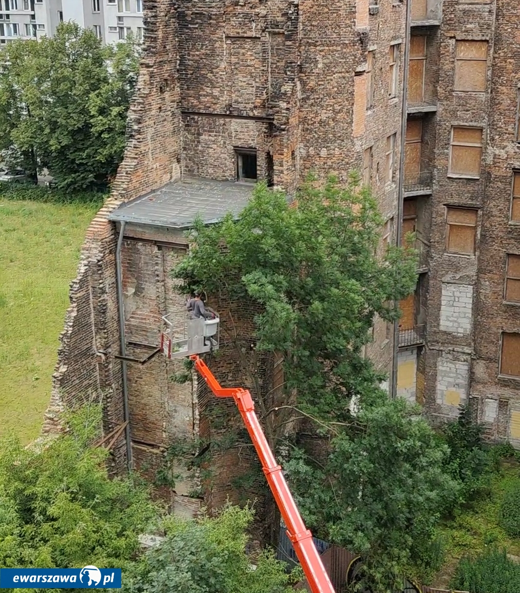 We wtorek przy kamienicy pojawił się dźwig oraz pracownicy, którzy zaczęli wycinać dziko rosnące drzewa wokół kamienicy. Być może są to pierwsze czynności związane z renowacją obiektu.