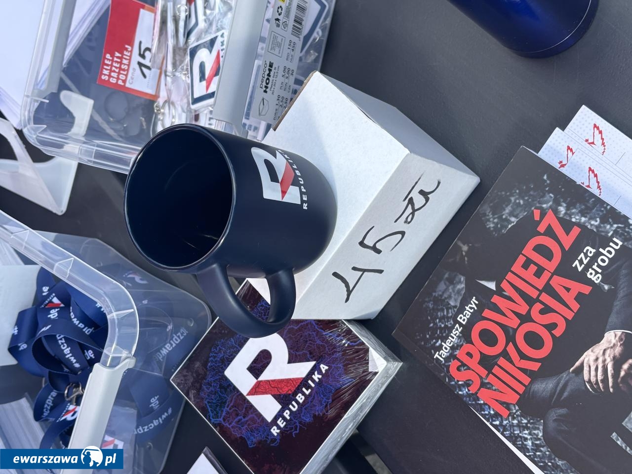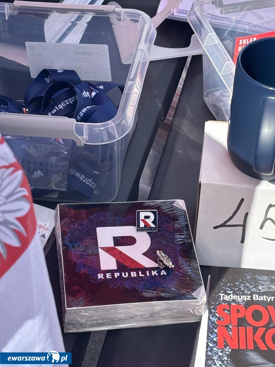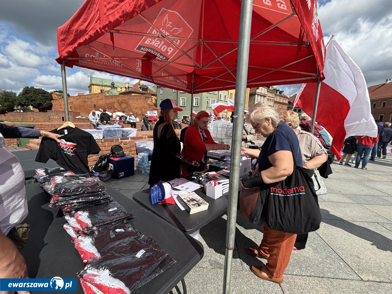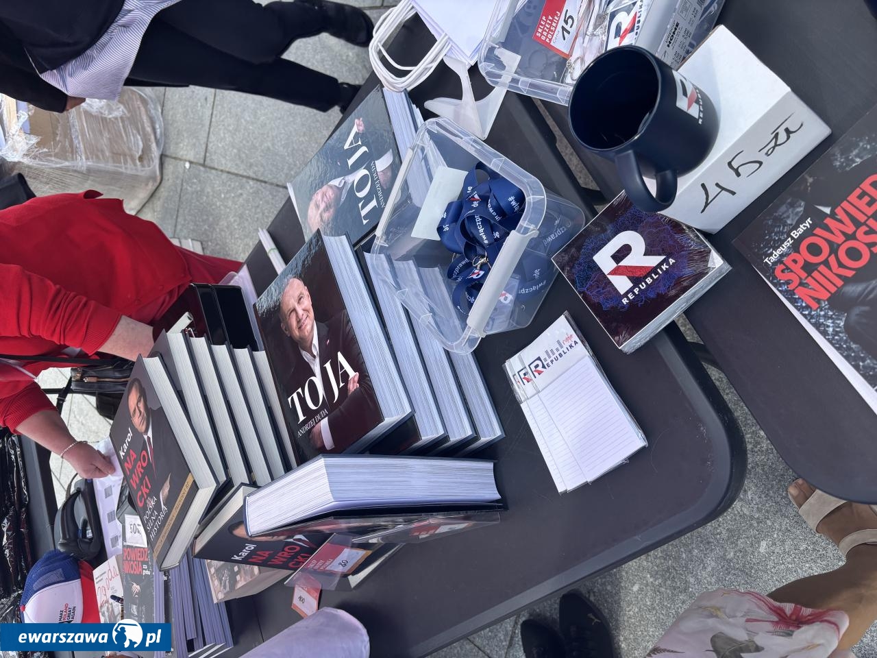 Swój stragan rozłożyła też Gazeta Polska sprzedając przedpremierowo za 80 zł. biografię Karola Nawrockiego. Poza tym znalazła się tam też autobiografia Andrzeja Dudy, kubki TV Republika za 45 złotych czy breloczki za 15 złotych. Wśród transparentów poza flagami z wizerunkiem Jezusa czy logiem stacji Republika, pojawiły się takie hasła jak: "Bóg, honor, ojczyzna", "Żeby Polska była Polską", "Polska na zawsze", "Karol Nawrocki = szczerość", "Karolu, prezydencie narodu, chroń, ratuj od zdrajców i wrogów", "Panie prezydencie obroniliśmy Polskę przed Potrzaskiem".