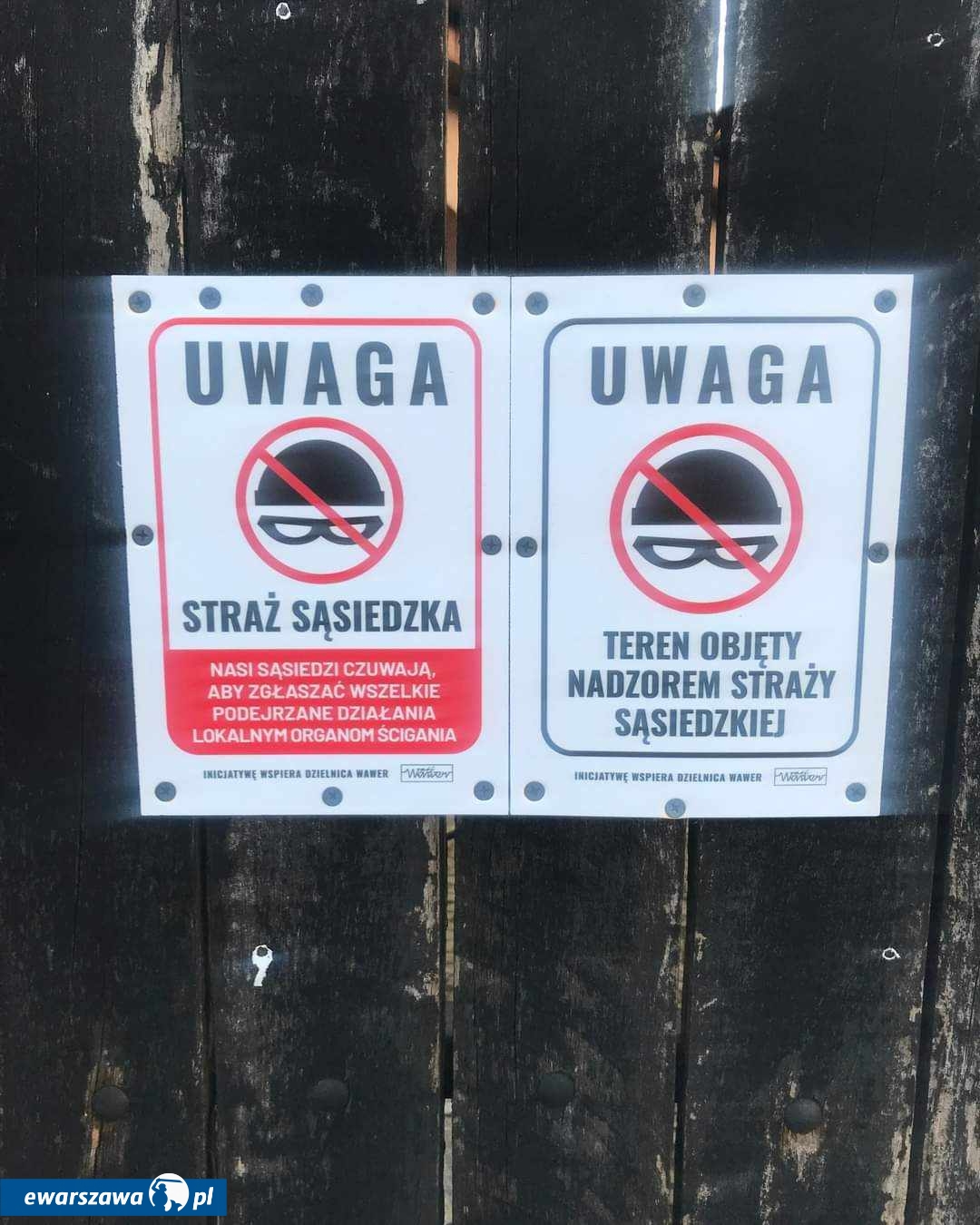 Przewodniczący rady dzielnicy Wawer Michał Żebrowski poinformował w social mediach, że na posesji wawerskiego osiedla wiszą tabliczki z napisem "Uwaga, teren objęty nadzorem Straży Sąsiedzkiej", co ma odstraszać potencjalnych włamywaczy. Według mieszkańców "Straż Sąsiedzka" bywa skuteczniejsza od służb, ponieważ jest często na miejscu. Gdy w okolicy dzieje się coś niepokojącego, członkowie "Sąsiedzkiej Straży" często przybywają szybciej niż wezwane służby.