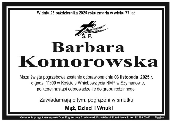 Jej pogrzeb odbędzie się w poniedziałek 3 listopada o godz. 11 w Kościele Wniebowzięcia Najświętszej Maryi Panny w Szymanowie. Spocznie w rodzinnym grobie.