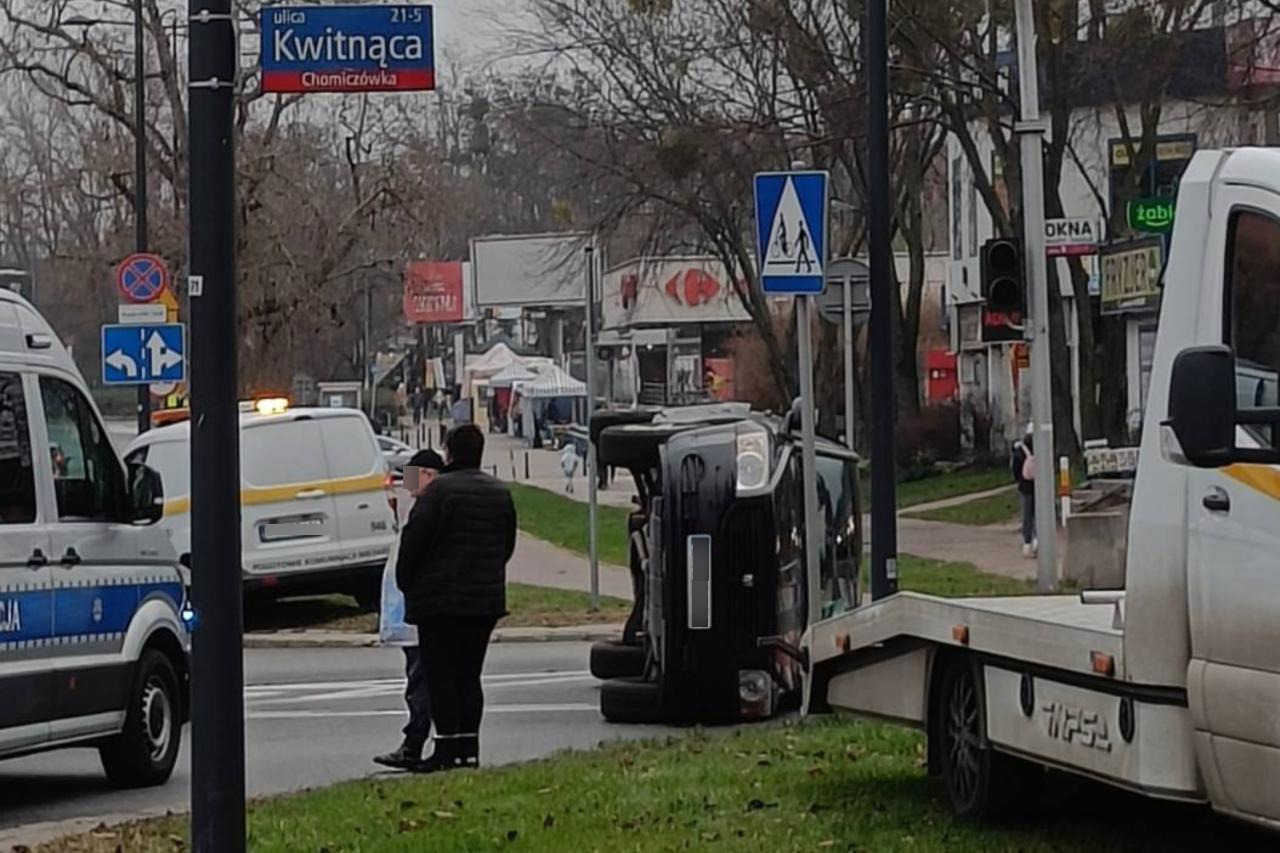 Zderzenie aut na Bielanach. Jedno dachowało i zatrzymało się na boku