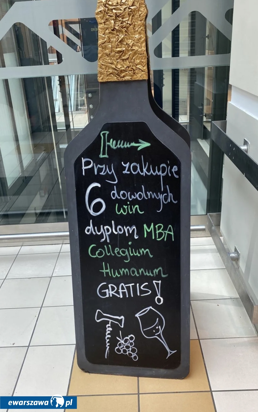 Stojak z reklamą 'Przy zakupie 6 dowolnych win, dyplom MBA Collegium Humanum GRATIS!' pojawił się przy winiarni w Blue City, napisał na wykopie RiczardH.