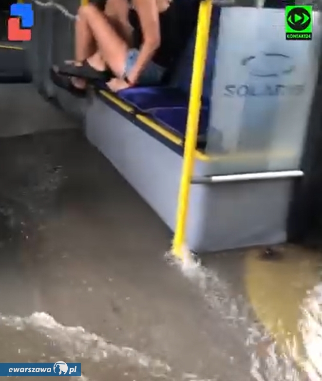 Kierowca autobusu wiózł pasażerów z Powsina do centrum Warszawy. Jeden z pasażerów nagrał film, jak w autobusie płynie woda z zalanej ulicy, a jedna z pasażerek musiała położyć nogi na siedzeniu, żeby nie zmoknąć.