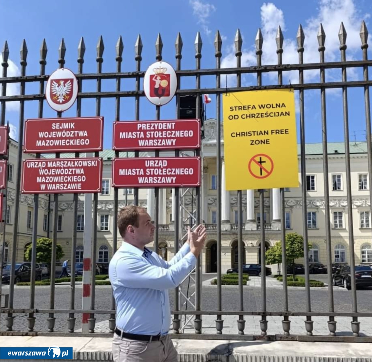 W internecie rozpowszechniono zdjęcie ogrodzenia Urzędu Miasta Warszawy z tablicą "strefa wolna od chrześcijan". Powieszenie tablicy nie było inicjatywą urzędu. Tablicę powiesili działacze Młodzieży Wszechpolskiej jako część "happeningu". Tablica wisiała prawdopodobnie tylko na czas zrobienia zdjęcia, bo jak potwierdziliśmy, zniknęła jeszcze tego samego dnia - nie wiadomo, kto ją usunął.