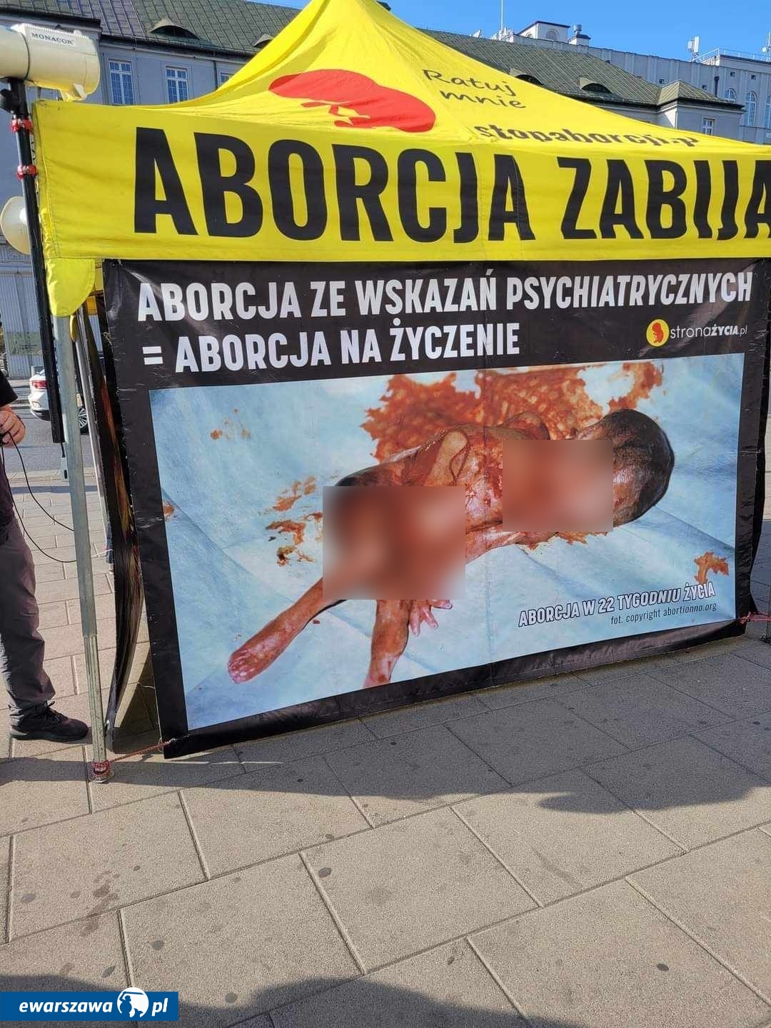 Na banerze widniało zdjęcie uszkodzonego ciała noworodka z dopiskiem "Aborcja ze wskazań psychiatrycznych = aborcja na życzenie".