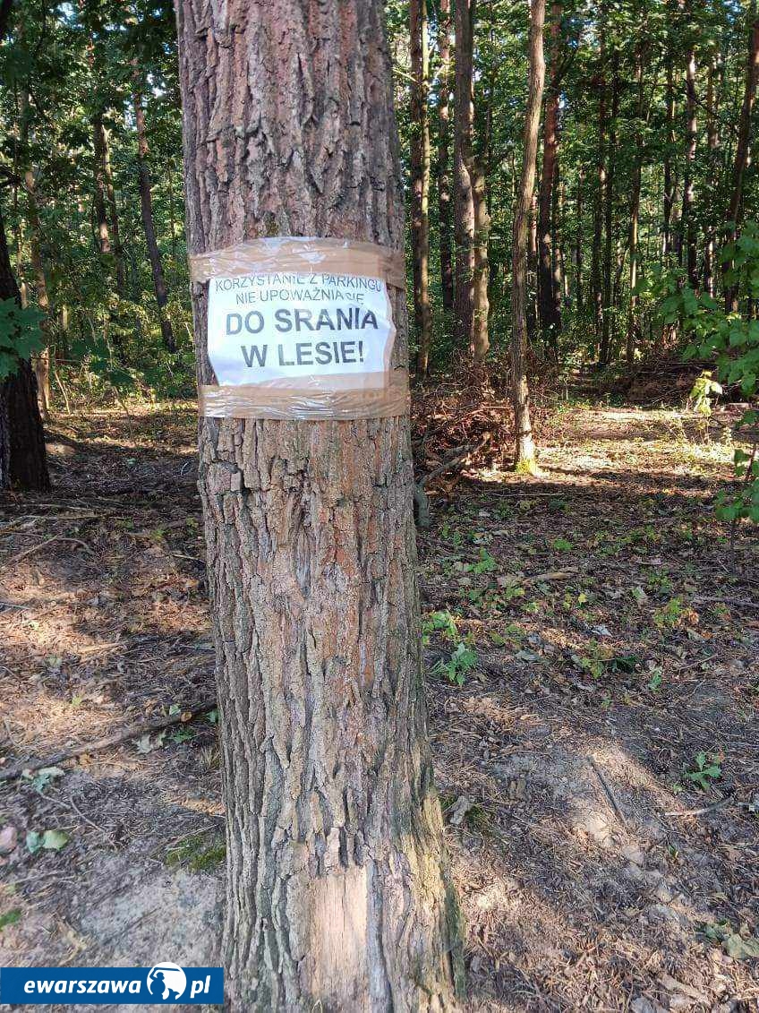 Ktoś przykleił list otwarty do drzewa w lesie. Treść listu brzmiała - Korzystanie z parkingu nie upoważnia do s*ania w lesie.