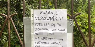 Ktoś przykleił kartkę ostrzegawczą na bramie wejściowej do działek. "Uwaga nożownik"