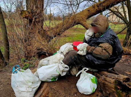 Mężczyzna w kryzysie bezdomności siedzi na Polu Mokotowskim i owija ciało reklamówkami