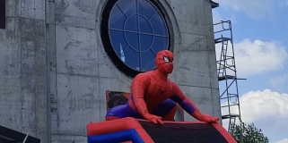 Dmuchany Spiderman przed kościołem na Pradze. "Był też iliuzjonista"