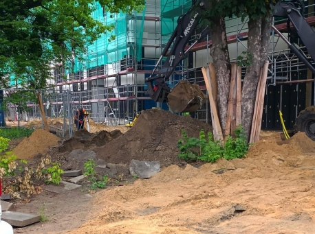 Podkopują koparką korzenie drzewa na placu budowy. "Robią wszystko, żeby uschło". Gdzie jest ostatnie pokolenie? "Mogliby wreszcie zrobić coś, co ma sens"