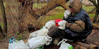 Mężczyzna w kryzysie bezdomności siedzi na Polu Mokotowskim i owija ciało reklamówkami