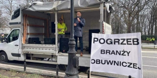 Donald Tusk dostał od producentów obuwia trumnę z butami. Premier nie pojawił się na spotkaniu podczas protestu