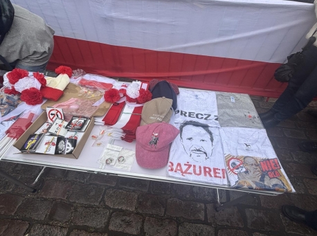 Koszulki "Precz z Bążurem" do kupienia na wiecu Kaczyńskiego. Uczestnicy woleli coś innego
