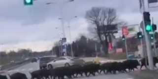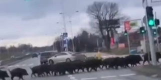 Ogromne stado dzików przeszło ulicą Warszawy po pasach na czerwonym świetle. "Złamały przepisy, trzeba je przeszkolić"