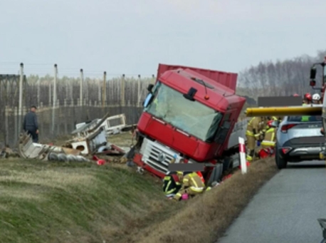 Groźny wypadek: ciężarówka w rowie, kierowca i pasażer poza pojazdem