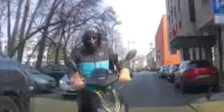 Dostawca jedzenia na skuterze wjechał na maskę samochodu osobowego. Kierowca jednośladu nie ma prawa jazdy, jechał pod prąd. Jest nagranie