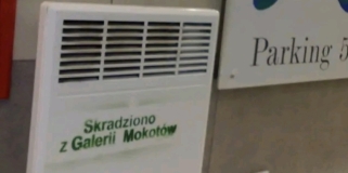 Grzejnik opatrzony napisem 'Skradziono z Galerii Mokotów'. Galeria: nie mamy z tym nic wspólnego
